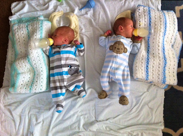 But only one of them was eating from a bottle this time so I get on the floor and put Harrison on the blanket and latch David again. Then I realize before I can feed Harrison he needs a burp cloth underneath him because the milk runs down his chin. The burp cloth was across the room. So I have to put David down again and grab it. Okay NOW I'm ready. I get David back on and get the bottle in Harrison's mouth and they're off!